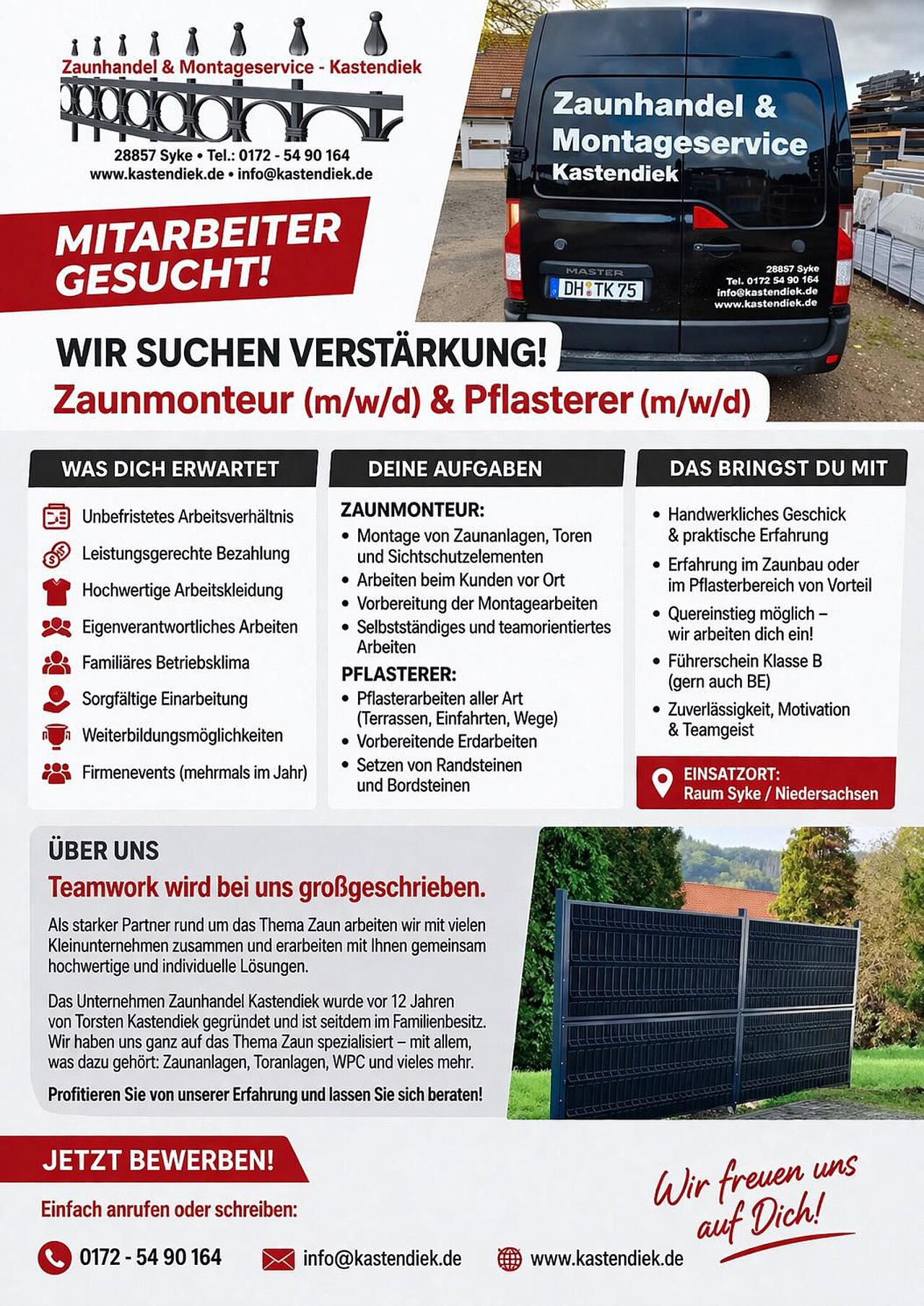 Das Unternehmen Zaunhandel & Montageservice Kastendiek mit Sitz in Syke sucht engagierte Verstärkung für sein Team. Als regional etablierter Fachbetrieb im Bereich Zaunbau und Montageservice legt das Unternehmen großen Wert auf Qualität, Zuverlässigkeit und Teamarbeit.